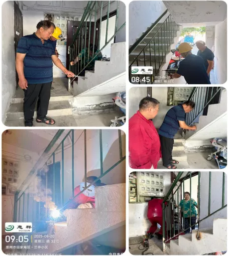夏末初秋的清晨,阳光依旧炙热耀眼。在淮南市物业管理协会副会长单位——惠群物业所辖的兰亭小区里,一阵阵金属焊接声打破了清晨的宁静。不同于施工的嘈杂,这声音里藏着一份暖心的守护——物业维修师傅正忙着为小区失独老人董奶奶焊接松动的楼梯扶手。