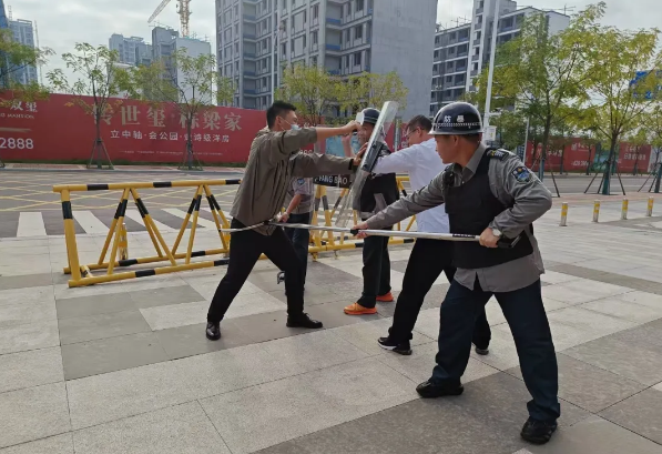 演练模拟“歹徒”持凶器强行闯入校园,安保人员迅速响应,分工协作:有人立即报警并封闭校门,有人持盾牌上前阻拦周旋,有人持防暴钢叉等器械伺机制服。项目经理第一时间赶赴现场指挥,在团队紧密配合下,“歹徒”被迅速控制。整个演练过程环节衔接顺畅,人员配合默契,事态得到有效控制。