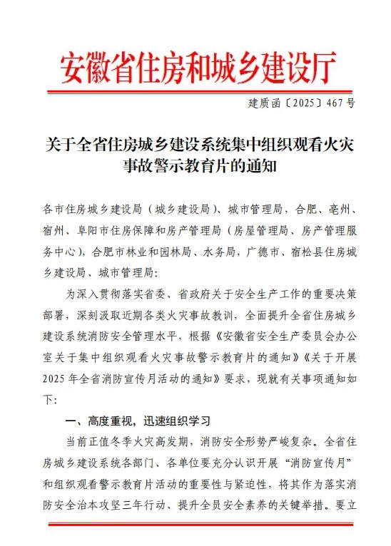 建质函〔2025〕467号关于在全省住房城乡建设系统集中组织观看火灾事故警示教育片的通知(正式稿)