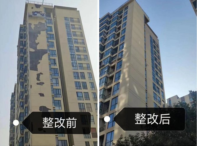 立面环境是城市的颜面,中化国际城小区位于泉山十字路口,破损、脏污的建筑外立面不仅拉低了城市的“颜值”,还因外墙面空鼓、脱落给业主造成室内不同程度的渗水情况,给业主的生活带来了诸多不便。