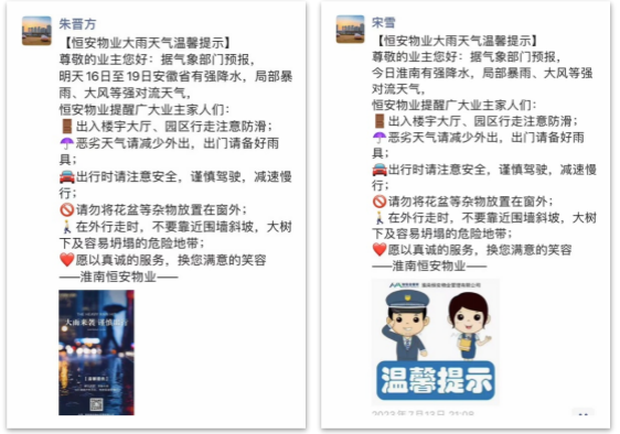 进入汛期后,恒安物业时刻关注天气变化,一旦发现近期可能出现的恶劣天气,物业管家会立即在朋友圈发送温馨提示,提醒业主们做好极端天气准备,同时注意行车减速等情况,及时有效地进行防洪度汛宣传。