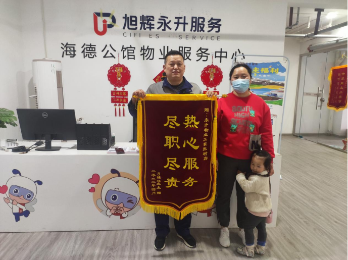 海德公馆4月11日收到锦旗一面,8号楼因男业主在外地工作,只有女业主带两个孩子在家,家里经常会出现无缘无故就断电的情况,再加上女业主对水电不是很懂所以为此感到很苦恼,工程张师傅得知情况后便主动积极的去业主家里排查原因,发现问题后立马制定解决方案,及时为业主解决了烦恼,业主赠送锦旗表示感谢并对工程张师傅的精湛技术和物业的热情服务点赞!