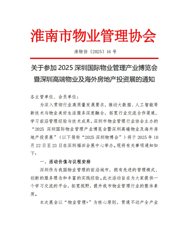 淮物协16号文:关于参加2025深圳国际物业管理产业博览会暨深圳高端物业及海外房地产投资展的通知PDF