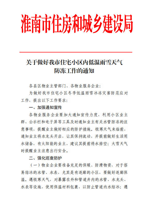 转发淮南市住建局:关于做好我市住宅小区内低温雨雪天气防冻工作的通知