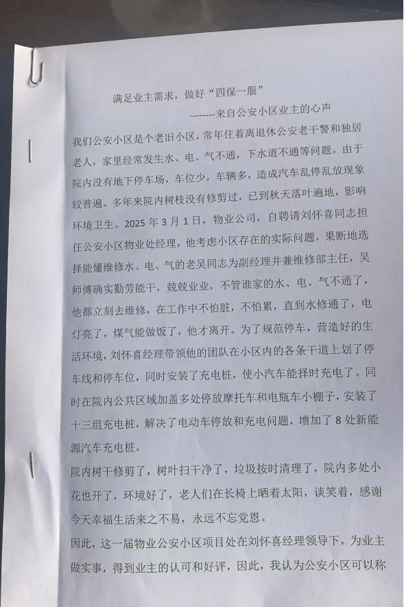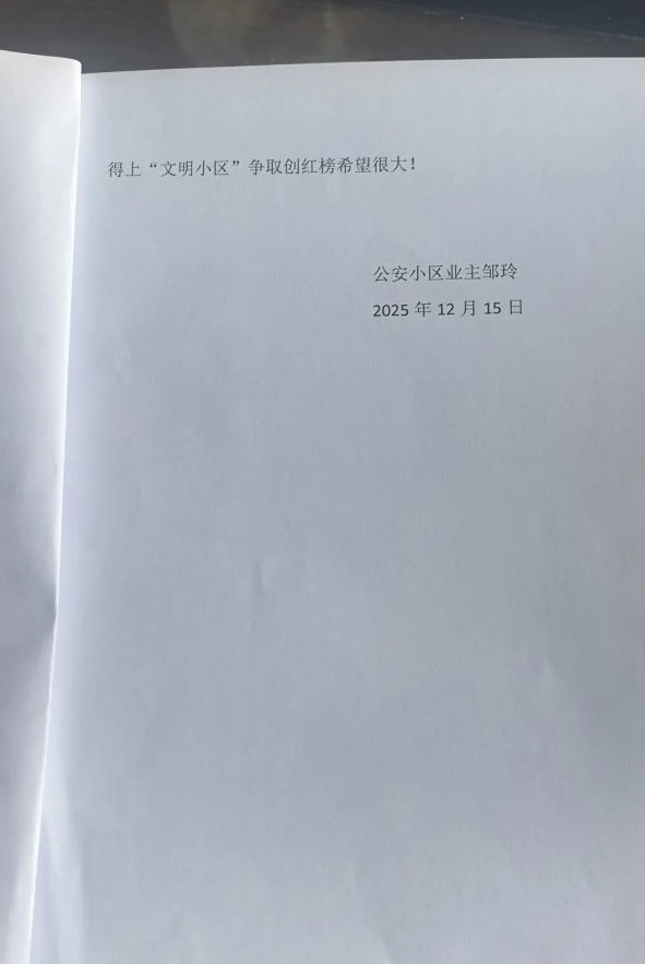 宏晔物业在公安小区的服务实践,生动诠释了物业管理服务行业“诚信服务、务实创新”的核心精神,也践行了协会推动行业高质量发展的倡议。他们没有追求浮华的表面文章,而是聚焦业主急难愁盼问题,以“小事不小视、实事办到底”的态度,把基础服务做精做细,用实际行动赢得了业主的高度认可与广泛赞誉,更让公安小区争创“文明小区”红榜的目标触手可及。