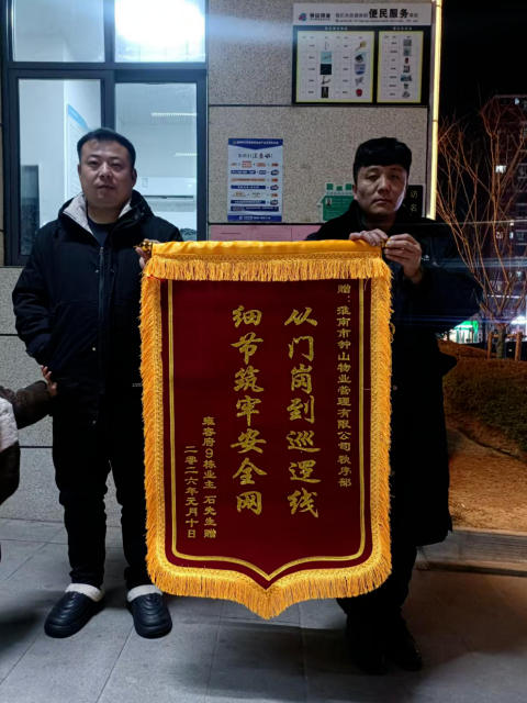 近日,淮南市物业管理协会会员单位——钟山物业雍荣府项目物业服务中心喜讯连连、暖意融融。短短数日之内,该中心先后收到两面鲜红锦旗,锦旗上分别印着“坚守岗位尽职尽责,贴心服务办实事”与“从门岗到巡逻线,细节筑牢安全网”的烫金大字,这是业主们满怀感激,郑重送至物业工作人员手中的诚挚谢意。一面锦旗是认可,两面锦旗便是沉甸甸的信赖。