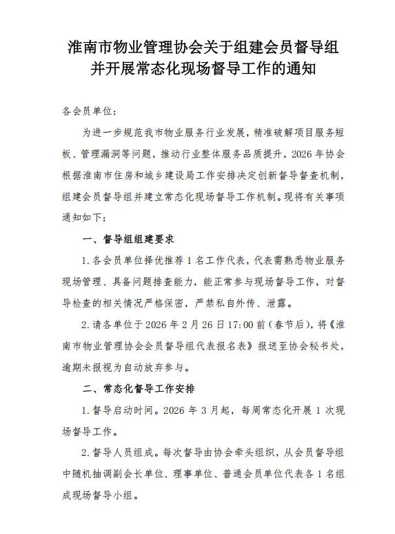 淮南市物业管理协会关于组建会员督导组并开展常态化现场督导工作的通知