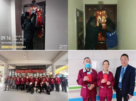 大年初一,至诚物业中至信壹号院、祥瑞物业为空置房业主张贴春联,让空置房屋也充满年味;淮南东华物业、民生新城物业、筑诚物业等为一线在岗职工发放红包,并向园区业主拜年送福,暖意融融。