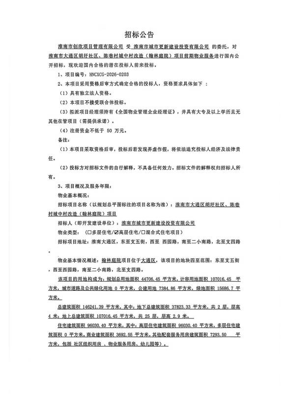 大通区胡圩社区、陈巷村城中村改造(翰林庭院)项目前期物业招标公告