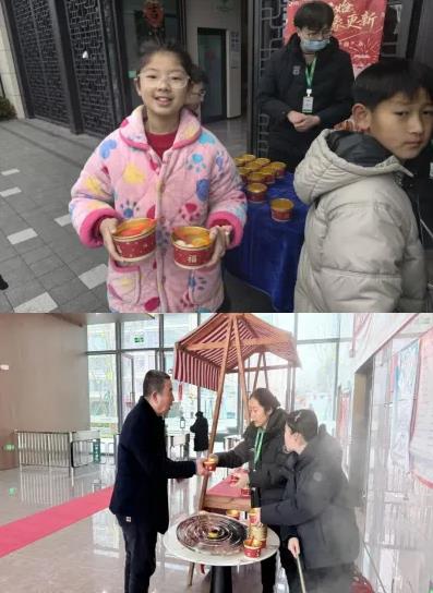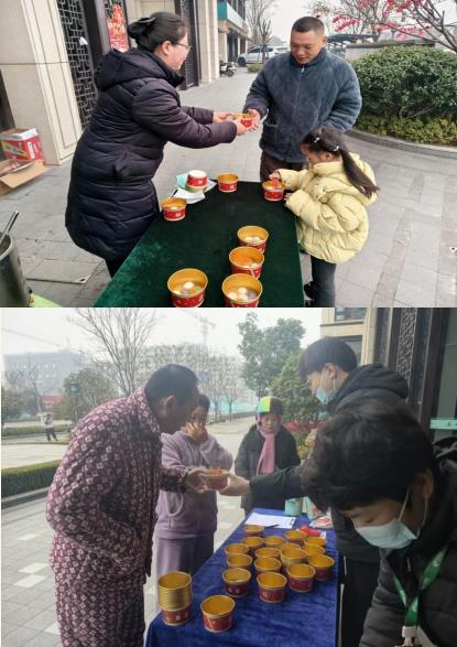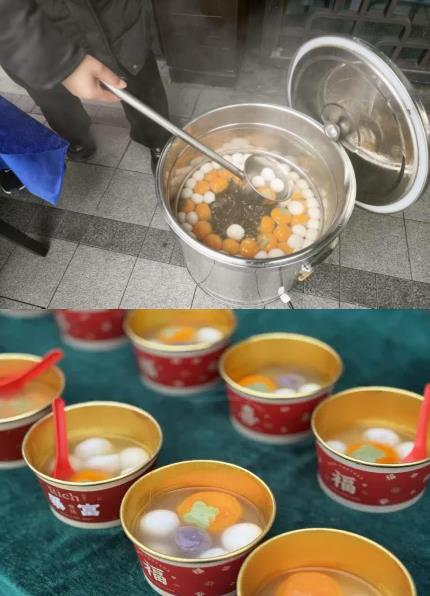 在大厅入口的派送处,早已排起了整齐的长队,工作人员麻利地盛着汤圆,一碗碗圆润饱满的汤圆,不仅裹着香甜的馅料,更藏着物业人的巧思与祝福。其中,造型别致的 “柿柿如意” 汤圆格外吸睛,五个小巧玲珑的汤圆环绕簇拥,寓意着新岁事事顺心、五福临门。业主们手捧热碗,吹一口热气,尝一口香甜,脸上洋溢着幸福的笑容。“每年元宵节都能吃到物业煮的汤圆,不仅甜在嘴里,更暖在心里!” 一位老业主笑着说道。