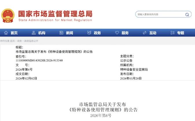 3月20日上午,市场监管总局召开2026年一季度例行新闻发布会,通报近期重点工作进展。其中,2026版《特种设备使用管理规则》今天通过总局官网正式对外发布,5月1日起正式施行。